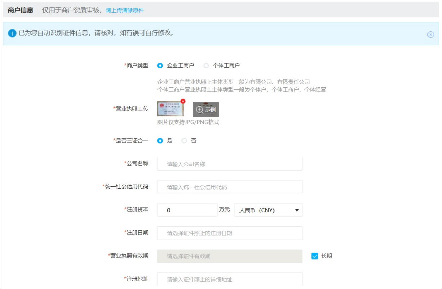 进入商户信息步骤,需先选择正确的主体类型,选择主体类型后,请根据页面提示上传相应证照,系统会自动OCR识别信息,请您进行核对,若有不正确可以手动修改。